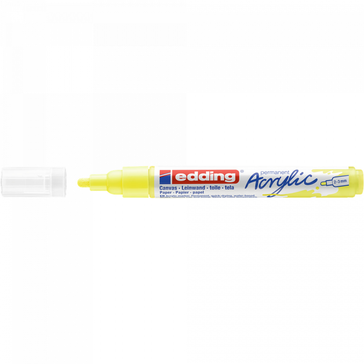 Akril marker világos vagy sötét felületekre történő festéshez, ideális olyan anyagokhoz, mint a vászon vagy a festőpapír. - A kerekített csúcs vonalvastagsága 2-3 mm. - A kiváló minőségű, pigmentált, vízbázisú akrilfesték száradás után rendkívül tartós, átlátszatlan, fényálló és szagtalan. - A neon sárga szín áttetsző. Megfelelő pótcsúcsok (edding 5100 pótcsúcsok) elérhetők.- 26 féle színválasztékban elérhető- Keresse a további változatokat - edding 5000 és az edding 5300-at, valamint az edding 5400 3D hatású 2 végű akril markereket. Katalóguskód: 36464