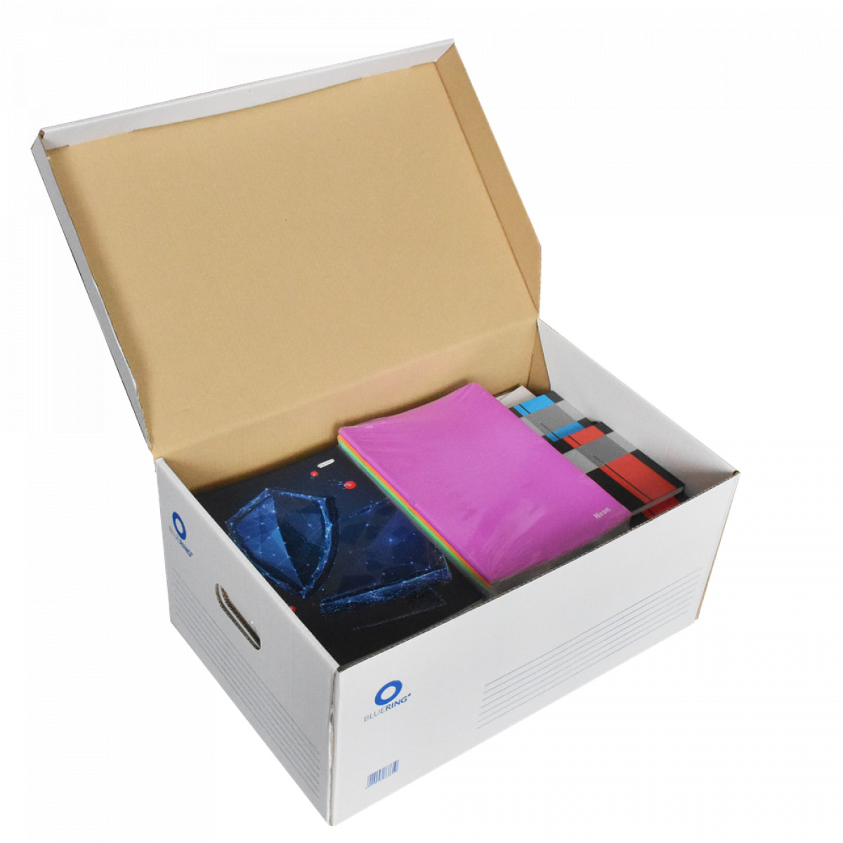 Archiváló konténer karton doboz fedeles 54x36x25cm, felfelé nyíló tetővel Bluering® fehér-kék bemutatása