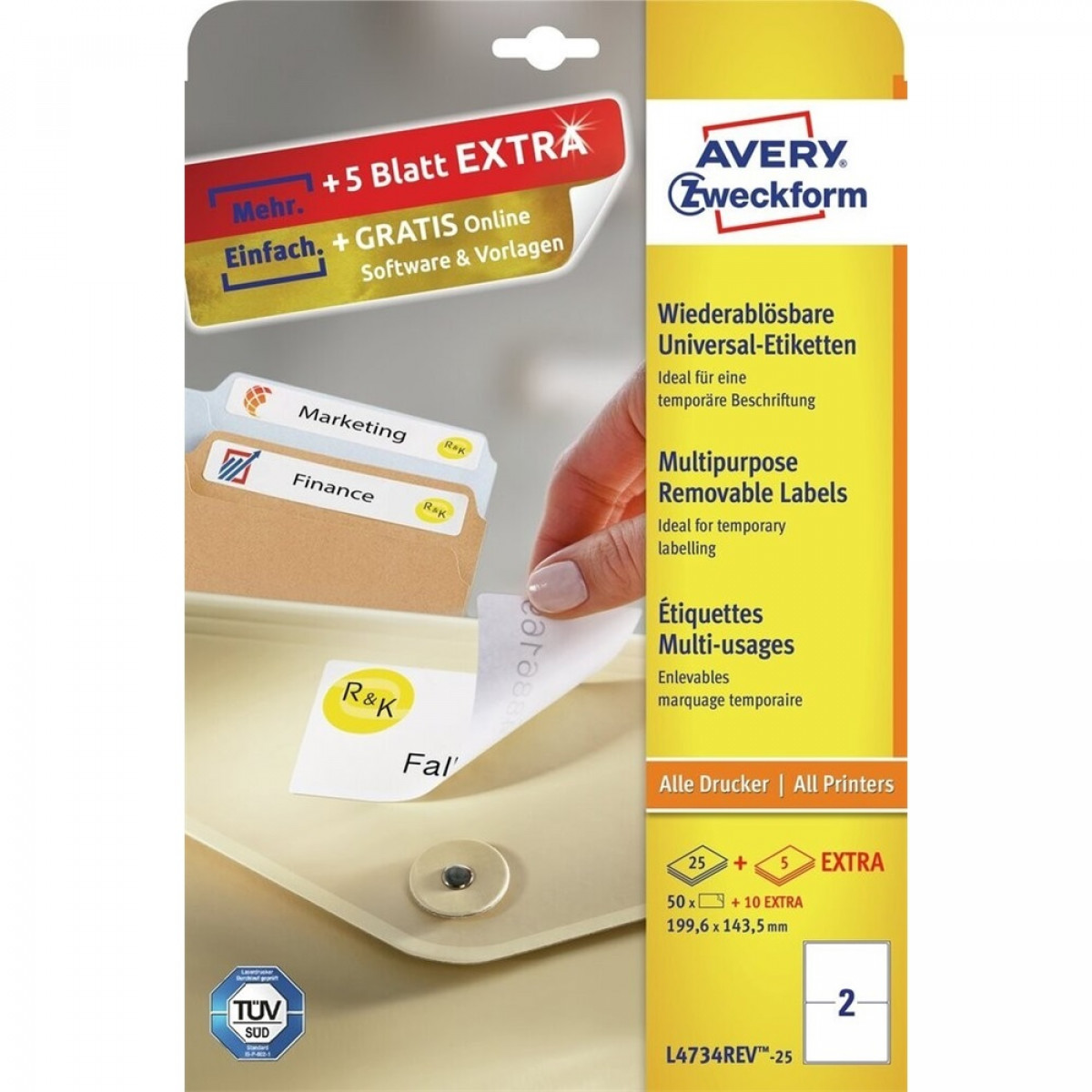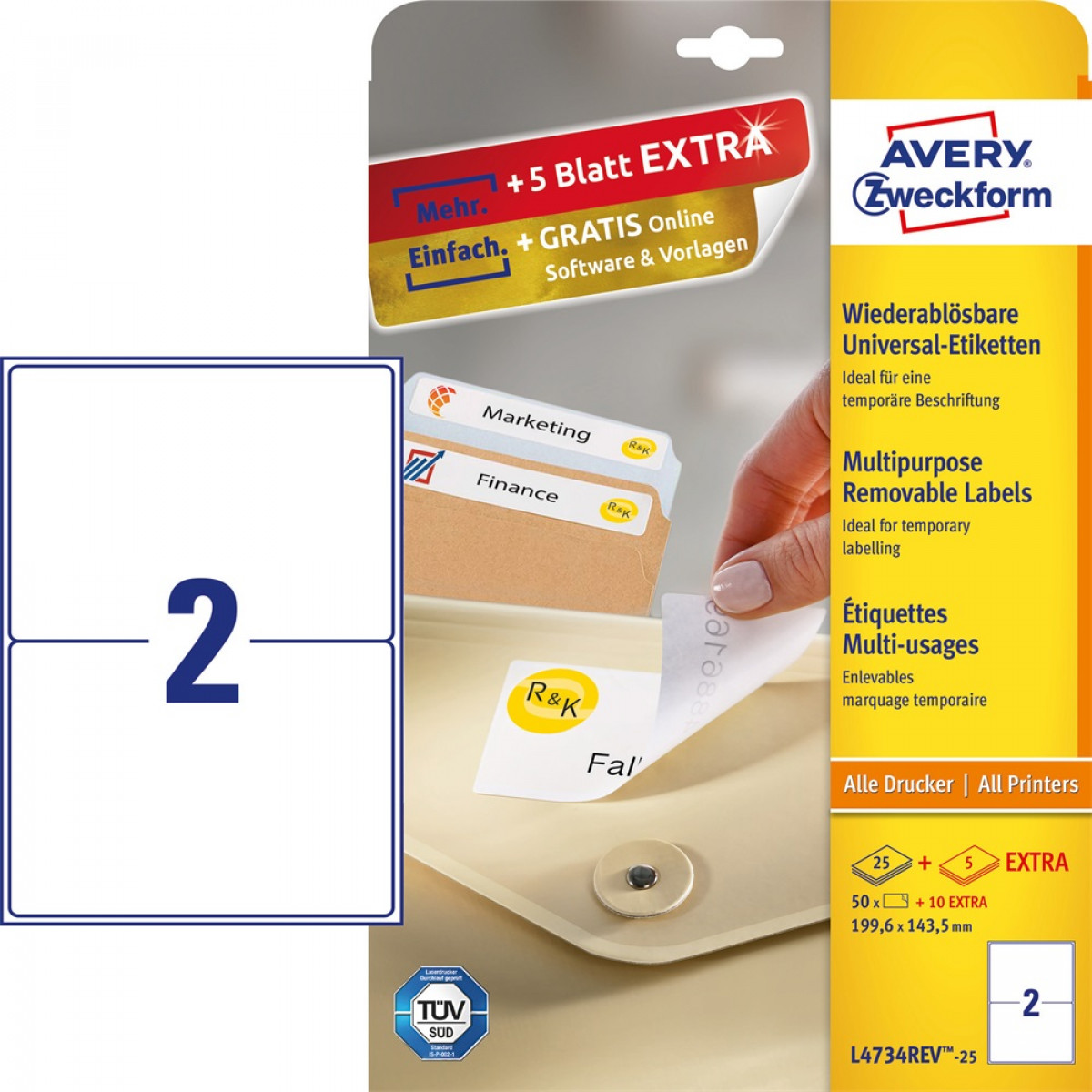 Etikett címke, 199,6 x143,5mm, univerzális visszaszedhető, 2 címke/ív, 25 ív/doboz, Avery fehér bemutatása