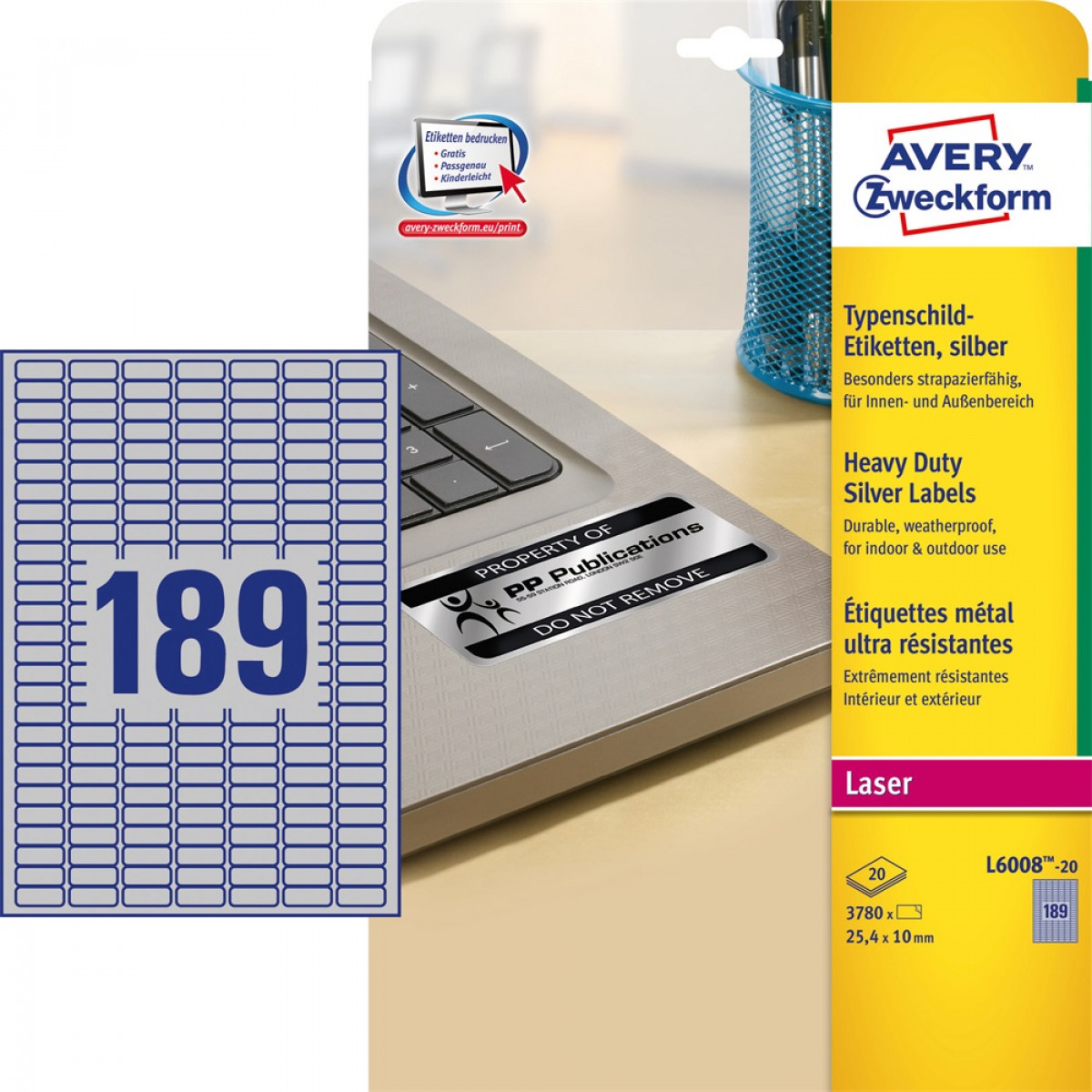 Etikett címke, 25,4 x10mm, ipari poliészter, 189 címke/ív, 20 ív/doboz, Avery ezüst bemutatása