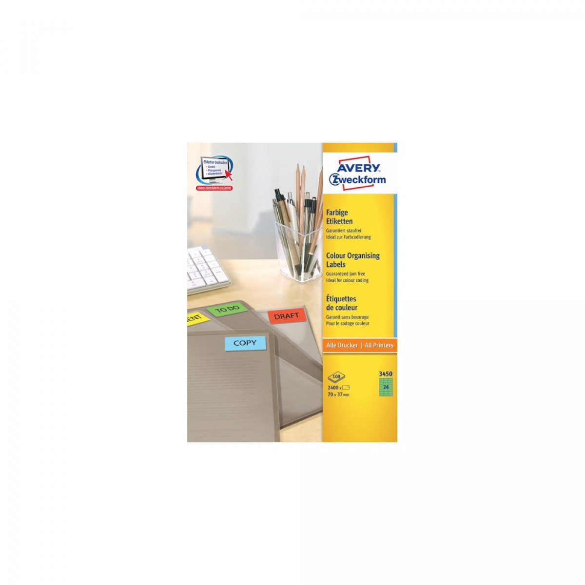 Etikett címke, 70 x37mm, univerzális, 24 címke/ív, 100 ív/doboz, Avery zöld bemutatása