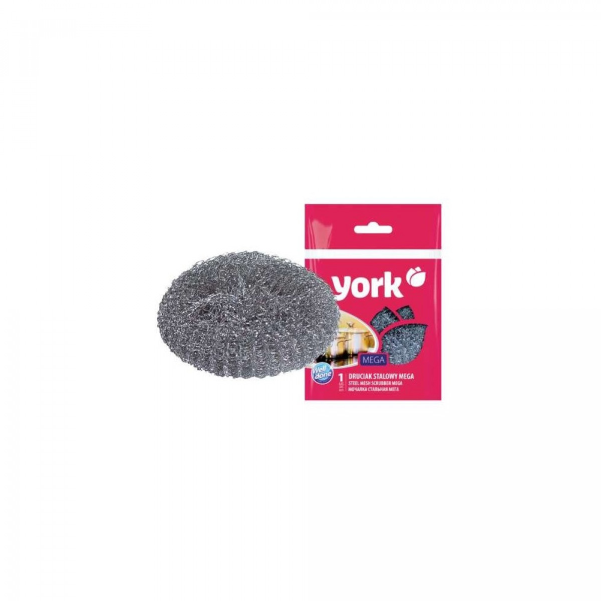 York Mega méretű acélhálós súroló párna. A spirál acél súroló erős és tartós, így hatékonyan távolítja el a makacs szennyeződéseket anélkül, hogy károsítaná a felületet. Különösen ajánlott olyan edények tisztítására, amelyek rozsdamentes acélból készültek, mivel az anyag nem karcolja meg azokat.