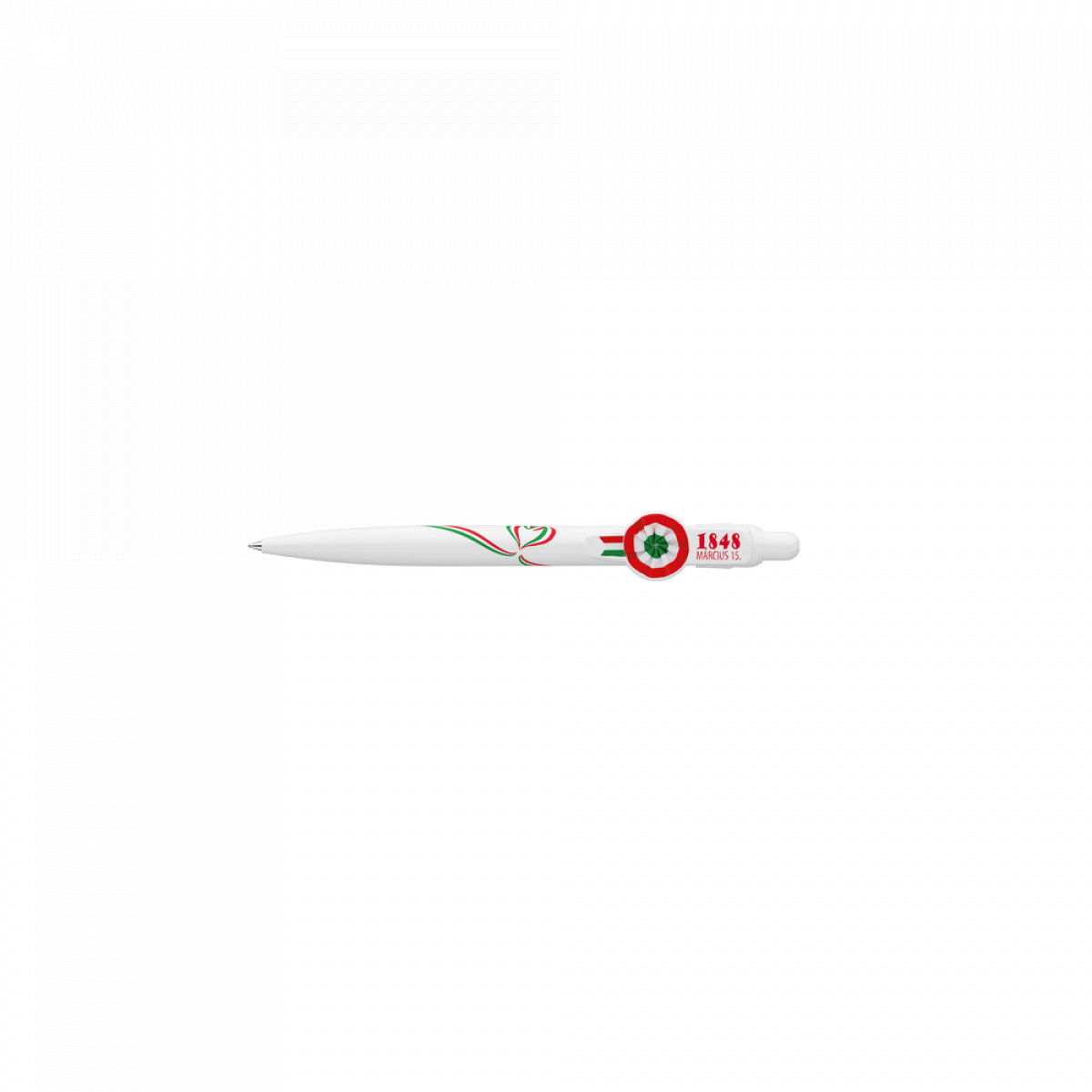 Magyar nemzeti motívumokkal díszített nyomógombos mechanikával működő golyóstoll 0,8 mm-es kék színű X-20as golyósbetéttel. Vonalvastagság: 0,8 mm. Íráshossz: 2500 m. 10 db/csomag Katalóguskód: 54795