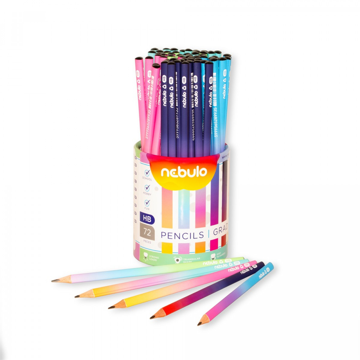 Háromszög grafit ceruza gradiens (színátmenetes) mintával, 72 db-os papír kínáló hengerben. A ceruzák vonalkóddal el vannak látva. keménység: HB
