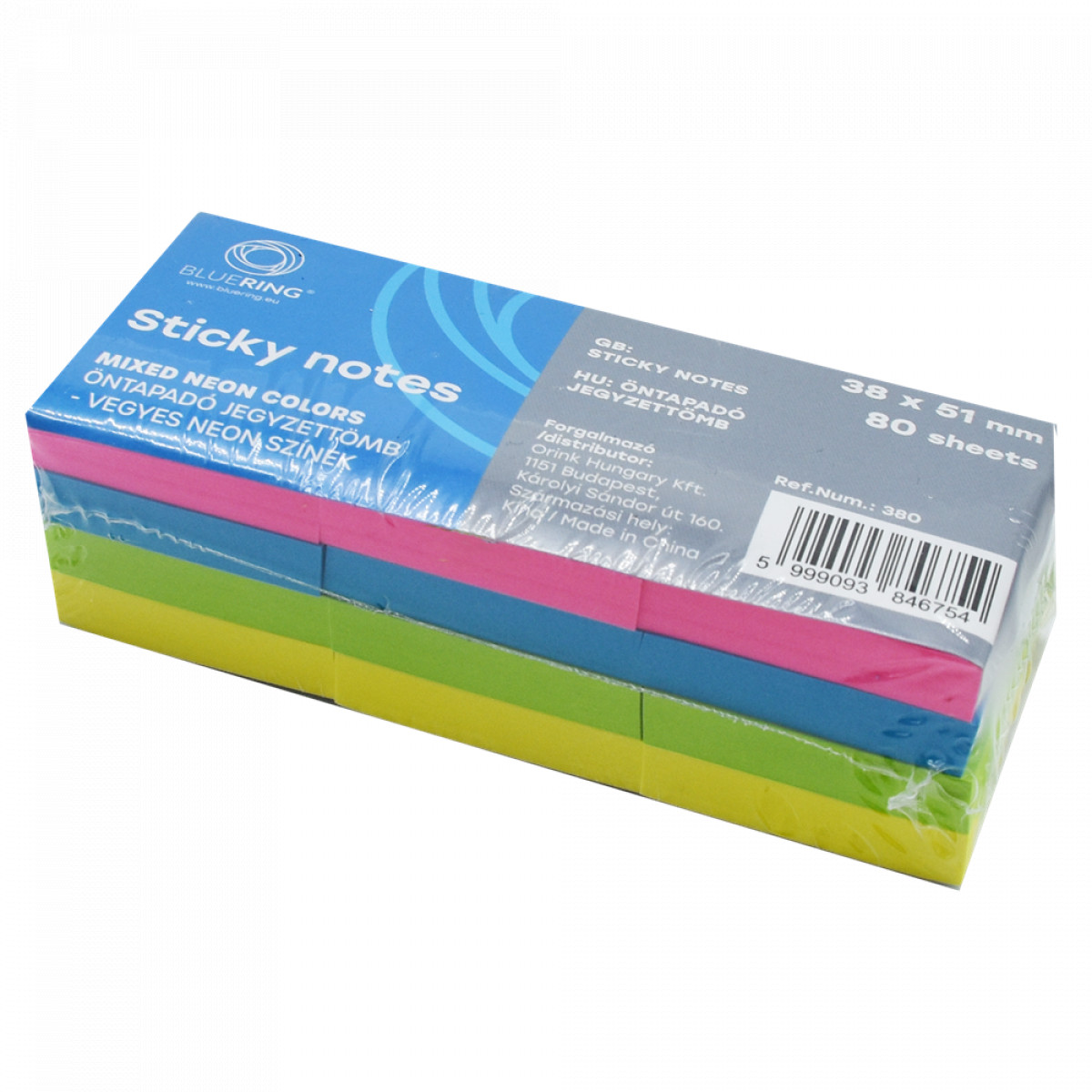 Jegyzettömb öntapadó, 38x51mm, 80lap, 12 tömb/csomag, Bluering® , neon bemutatása