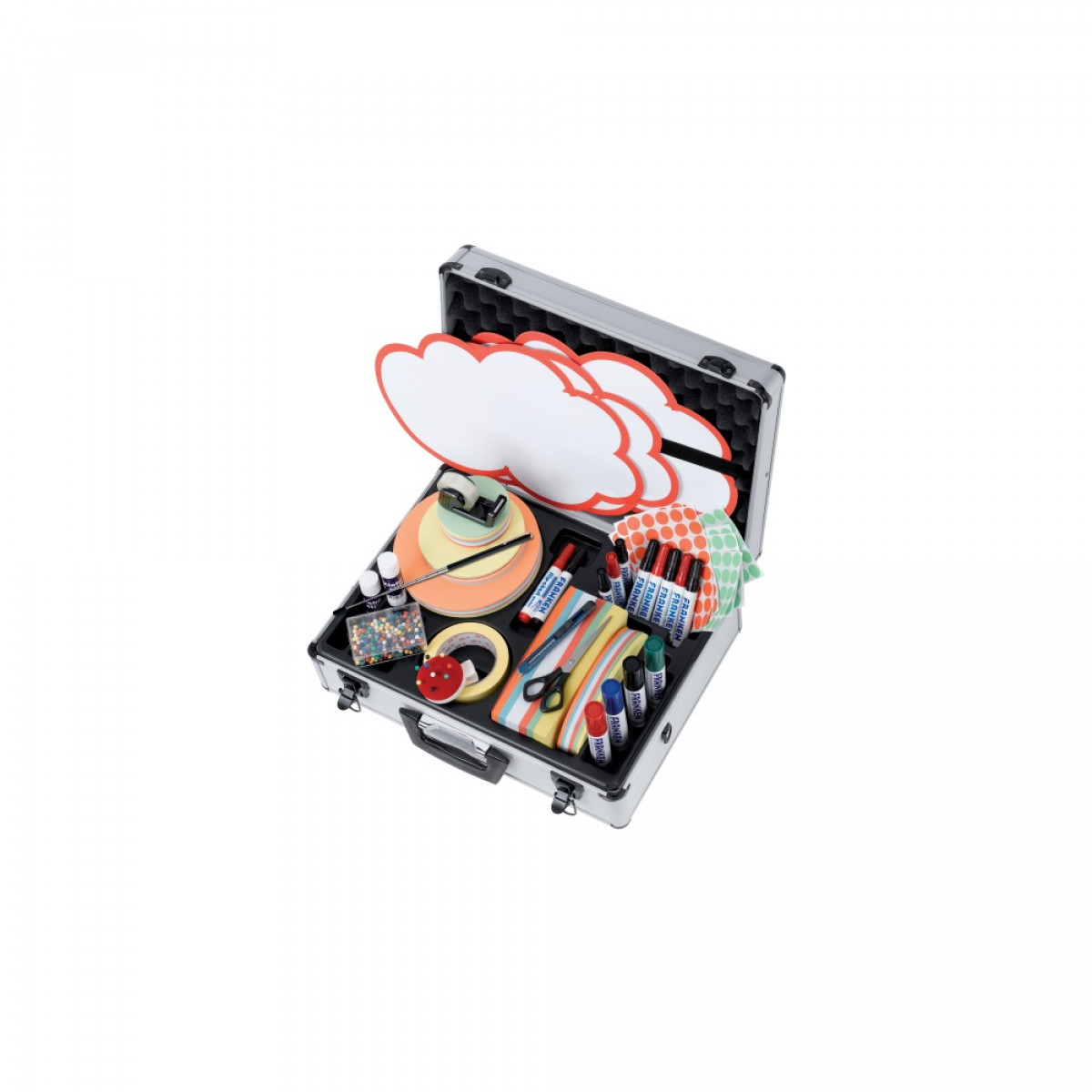 Zárható, robusztus alumínium bőrönd. Súly a tartozékokkal együtt: kb. 6 kg. A bőrönd levehető hordszíjat és tartozékok széles választékát tartalmazza: 5 db. moderációs felhők 25 x 42 cm 500 db. moderációs kártyák téglalapok 20,5 x 9,5 cm, 6 színben válogatott 200 db. moderációs kártya ovális 19 x 11 cm, 6 színben válogatott 200 db. moderációs kártyák ? 9,5 cm, 6 színben válogatott 150 db. moderációs kártyák ? 14 cm, 6 színben válogatott 150 db. moderációs kártyák ? 19,5 cm, 6 színben válogatott 520 darab egyenként piros és zöld jelölőpontok 10 flipchart jelölő (6x fekete, 4x piros) 4 jumbo marker (piros, zöld, kék, fekete) 1 db Papírolló, ragasztó fólia adagolóval, maszkoló szalag, 2 ragasztórúd, tűpárna, vágó, lézermutató 300 tűs kerek fejjel Méret SZxMxM: 48 x 16 x 37 cm.Hiteles tájékoztatás: Elkötelezettek vagyunk termékeink biztonságának garantálásáért, nyomon követjük a termékbiztonsággal kapcsolatos valamennyi európai uniós és hazai szabályozást és biztosítjuk termékeink azoknak történő megfelelését. Az EU 2023/988-as számú Általános Termékbiztonsági Rendeletét (GPSR) is alkalmazzuk, így ha a termékeink biztonságát illetően fogyasztóként kérdése, észrevétele van, vagy esetleg balesetről van tudomása, kérjük, írja meg nekünk. GPSR: LEITZ ACCO Brands GmbH & Co KG Siemensstr. 64, D-70469 Stuttgart, Germany https://www.esselte.com