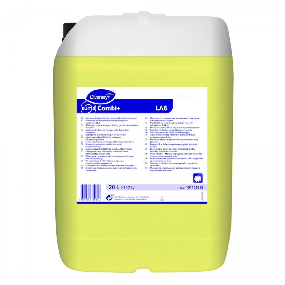 A Suma Combi + LA6 nagy hatékonyságú, lúgos kémhatású folyékony gépi mosogató és öblítőszer, amely egytartályos vagy elöltöltős mosogatógépek széles körénél használható (szállítószalagos vagy többtankos gépekhez nem alkalmas). A benne található maró lúg és vízkövesedésgátlók keveréke kiválóan eltávolítja a szennyeződéseket. A hatékony vízkövesedésgátló összetevők nagy mennyisége még 12nko vagy 215 ppm vízkeménység mellett is megakadályozzák a vízkő kialakulását. Különleges öblítőadalékot tartalmaz, amely megváltoztatja a víz viselkedését, így nincs szükség külön öblítőszer hozzáadására.