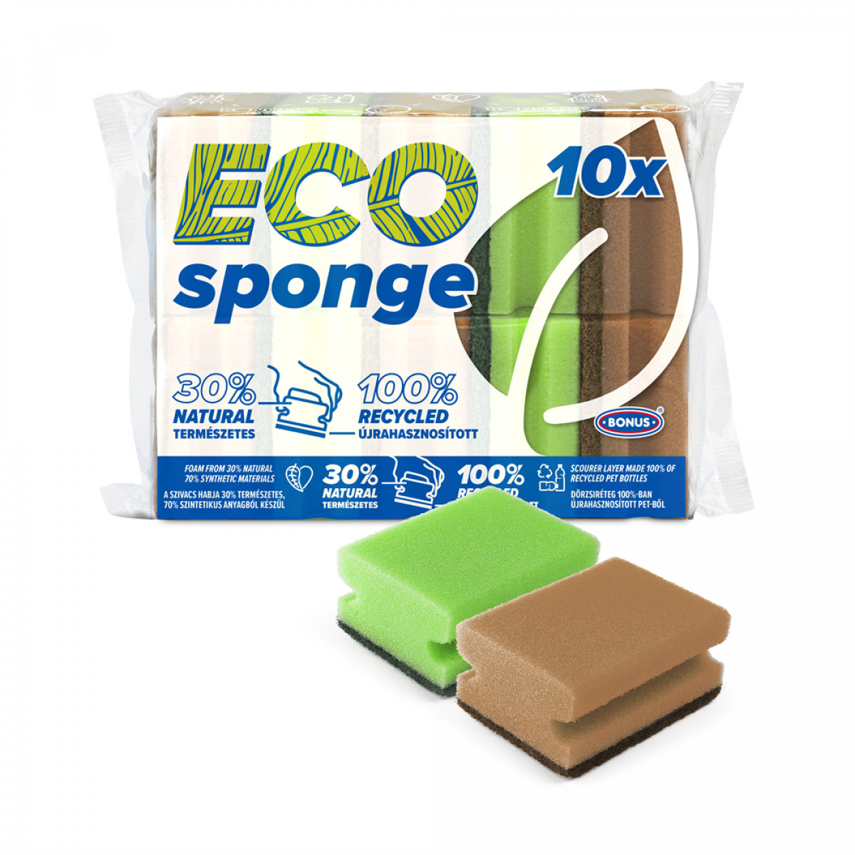 A 10 darabos kiszerelésű BONUS formázott mosogatószivacs igazán gazdaságos, így egyetlen csomaggal akár az egész háztartás igényét kielégíthetjük. Szivacsrétege 30%-ban természetes anyagból készült, míg dörzsi rétege 100%-ban újrahasznosított anyagból, így kímélve a környezetet.