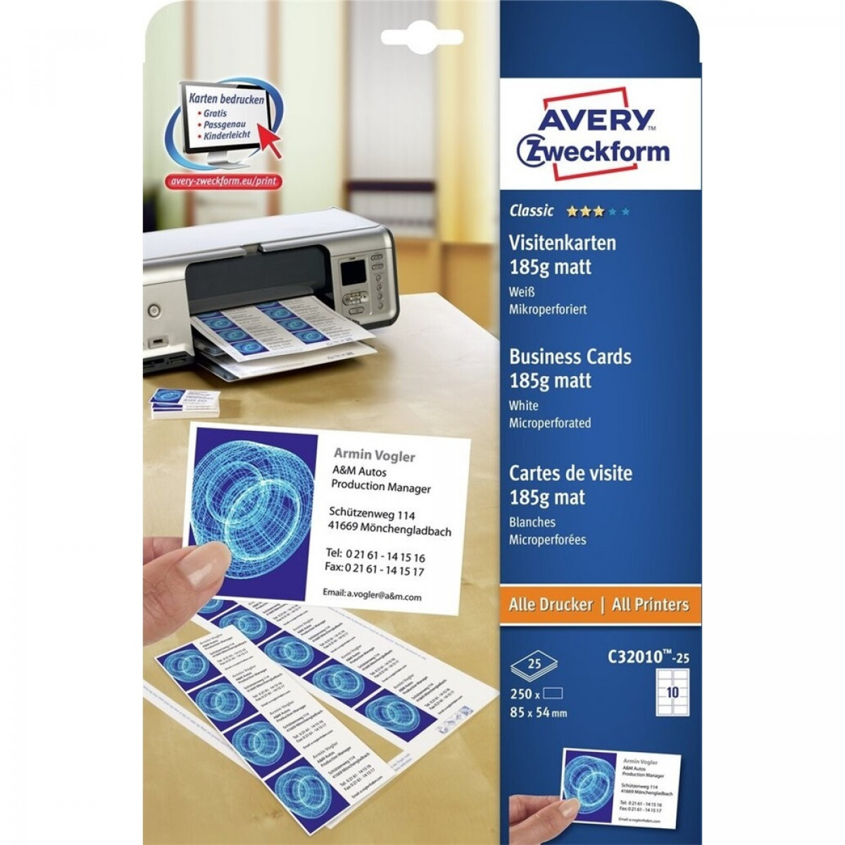 Névjegykártya, mikroperforált élekkel, kétoldalas 185g-os, 25 db, Avery matt fehér bemutatása