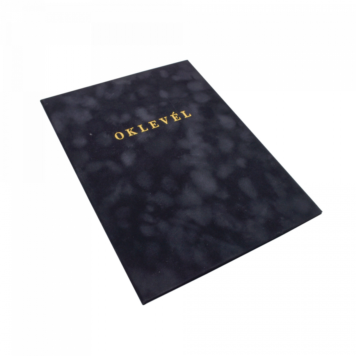 A4 méretű oklevelek tárolására alkalmas, plüss borítás, nyitott állapotban, jobb oldalon 4 szatén szalaggal. Borítón arany "OKLEVÉL" nyomattal méret: 233x312x7mm Katalóguskód: 44071