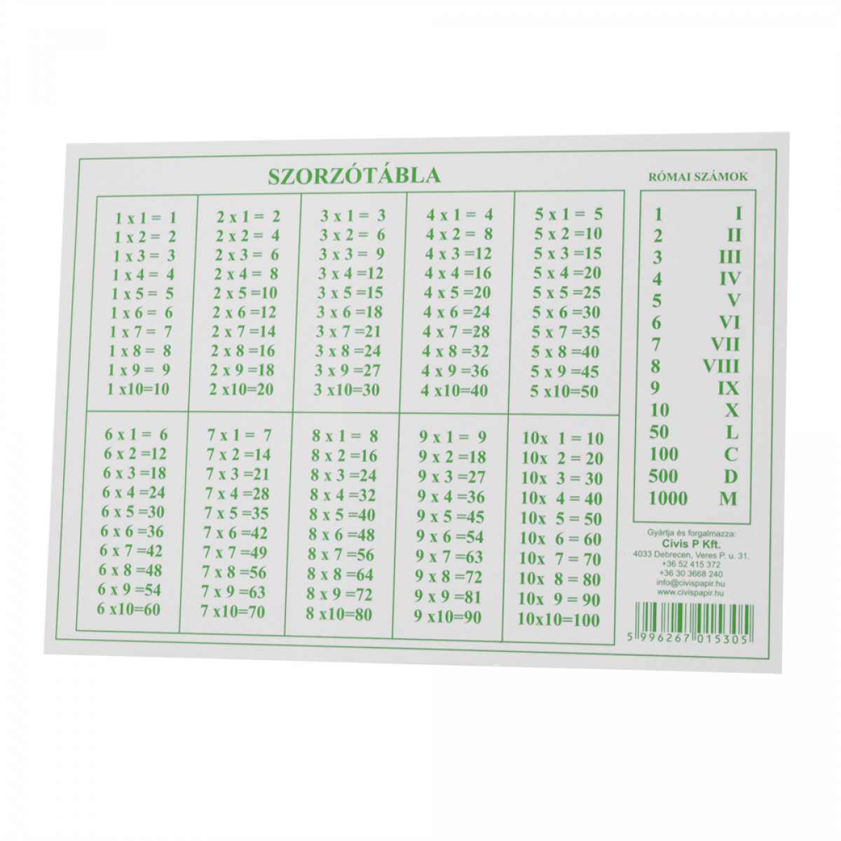 Műanyag szorzótábla gyerekek részére. A szorzótáblán kívül római számokat is tartalmaz. Méret: 15x10 cm Katalóguskód: 34497 Hiteles tájékoztatás: Elkötelezettek vagyunk termékeink biztonságának garantálásáért, nyomon követjük a termékbiztonsággal kapcsolatos valamennyi európai uniós és hazai szabályozást és biztosítjuk termékeink azoknak történő megfelelését. Az EU 2023/988-as számú Általános Termékbiztonsági Rendeletét (GPSR) is alkalmazzuk, így ha a termékeink biztonságát illetően fogyasztóként kérdése, észrevétele van, vagy esetleg balesetről van tudomása, kérjük, írja meg nekünk. GPSR: Cívis P Kft 4033 Debrecen, Veres Péter u.31. Email: info@civispapir.hu