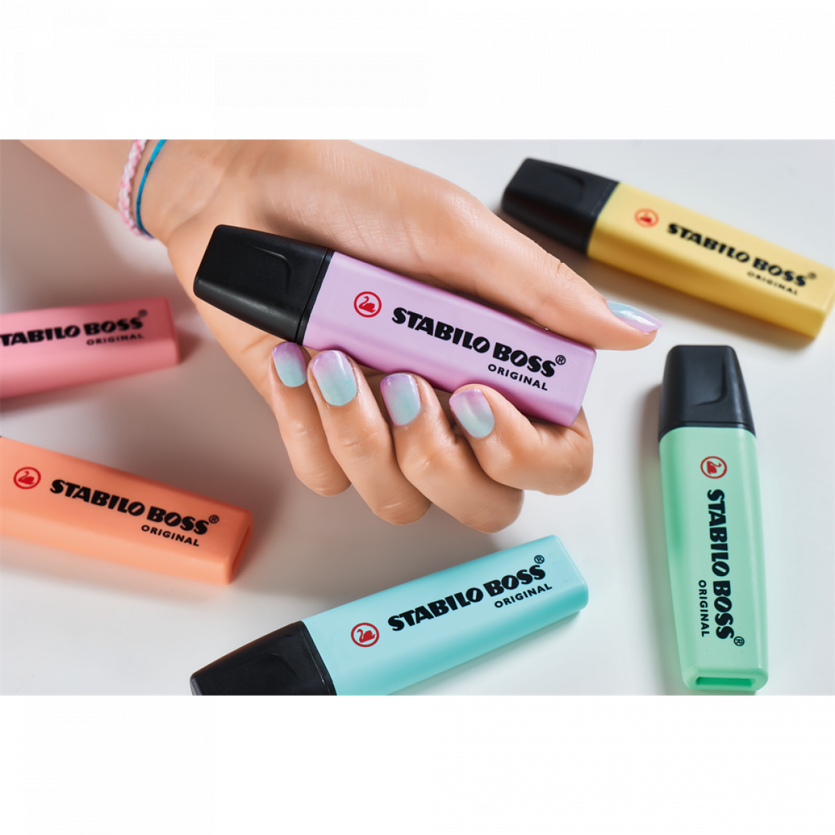 Szövegkiemelő készlet 2-5mm, vágott hegyű STABILO Boss original Pastel, 6 klf. szín bemutatása